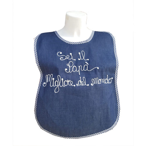 Hai presente quella riunione importantissima a sorpresa in ufficio che puntualmente si terrà subito dopo la pausa pranzo in cui quel malefico schizzo di sugo dopo un triplo salto mortale carpiato si schianterà sulla tua camicia nuova?Non farti cogliere impreparato!Gioca d’ anticipo! Il bavaglino adulti di Abruzzo Ricami, occupando praticamente zero spazio, è l’ ideale da portare sempre con te! Personalizzalo con una dedica oppure con il tuo soprannome d’ ufficio per strappare un sorriso ai tuoi colleghi e vedrai…ne vorranno uno anche a loro!
