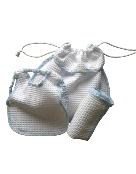 Set asilo personalizzato realizzato e ricamato a mano in 100% cotone a nido d’ ape,comodamente lavabile in lavatrice, disponibile in due varianti: