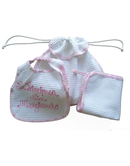 Abruzzo Ricami ha pensato a voi proponendovi questo set asilo personalizzato che coniuga la morbidezza del cotone per la pelle delicata del vostro bambino alla trama del migliore nido d’ ape presente sul mercato per un’ assorbenza estrema e una resistenza oltre ogni aspettativa!
