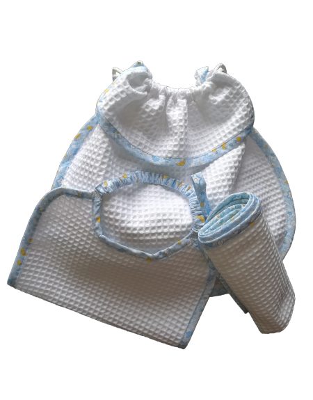 Set asilo personalizzato realizzato e ricamato a mano in 100% cotone a nido d’ ape,comodamente lavabile in lavatrice, disponibile in due varianti: